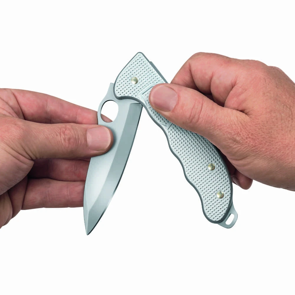 The Victorinox Swiss Army Alox Hunter Pro Folding Lockblade provides one essential blade and is designed for easy, one-hand blade access. The heavy gauge stainless steel pointed blade locks securely into place for safety until the release is pressed. The handle of this folding lockblade is made from Victorinox’s popular aluminum oxide, or Alox, which gives this version of the Hunter Pro a slimmer profile and makes it extremely durable. The handle’s modern, ribbed finish makes this knife easy to hang on to.